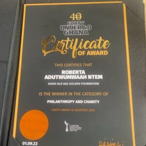 Good Old Age Golden Foundation was awarded as the best Best Philanthropy and Charity Organization for the year 2023 under the Forty under Forty Ghana awards night. The winners of the Under 40 Awards was held on Friday, 1st September 2023, at the De Icon Events Centre in Accra.